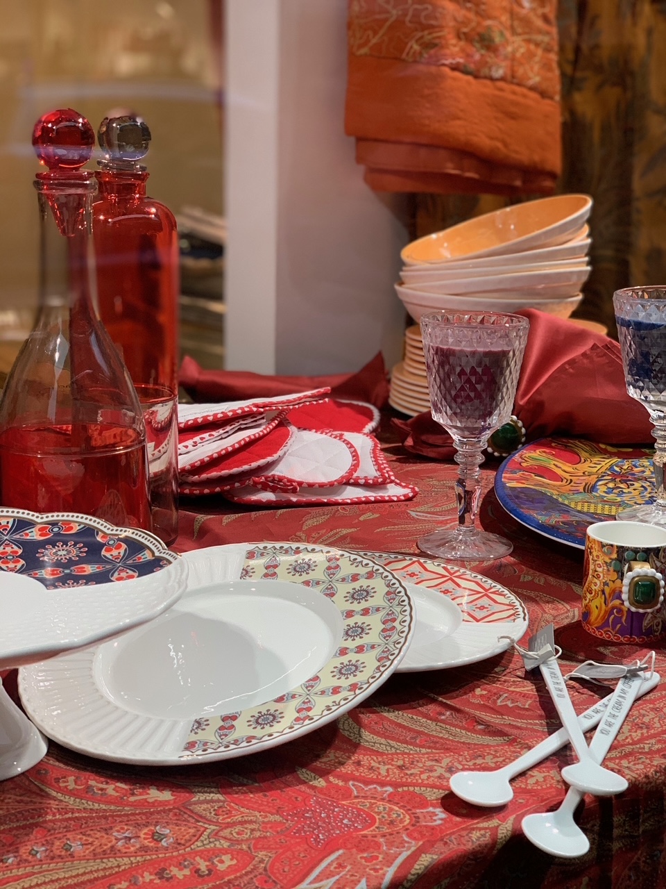 tavola natalizia più è barocca, più richiama il clima di festa. Tovaglia rossa, piatti decorati, calici, decanter colorati e cucchiaini addobbati per riempire di entusiasmo i più bei giorni dell'anno | ||